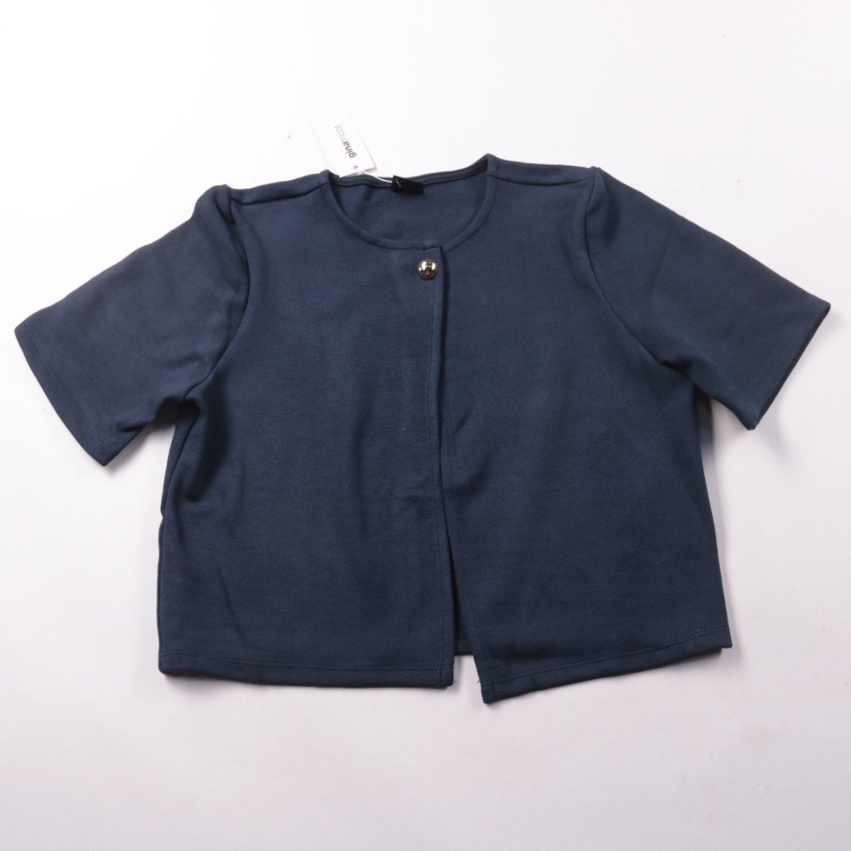 Женский укороченный жакет Gina Tricot темно-синего цвета с коротким рукавом и застёжкой на одну пуговицу. Подойдёт для офисных образов и повседневной носки в тёплую погоду, хорошо сочетается с платьями и брюками. Трикотажная ткань с добавлением эластана комфортно тянется и не сковывает движения.