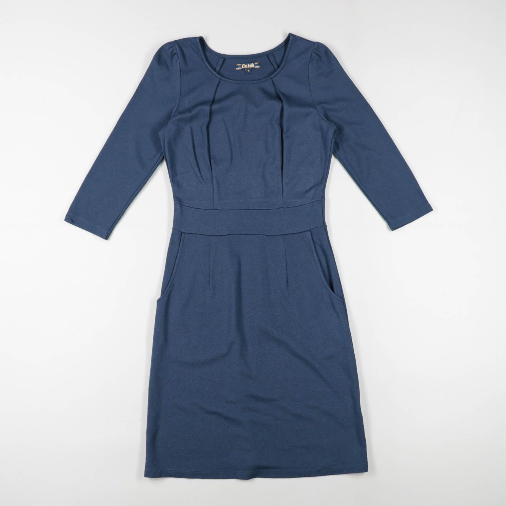 Повседневное платье King Louie в синем цвете, с рукавом 3/4 и мягкими складками по лифу. Подойдёт для офиса и на каждый день, хорошо смотрится с жакетом или кардиганом. Практичный плюс — есть боковые карманы.
