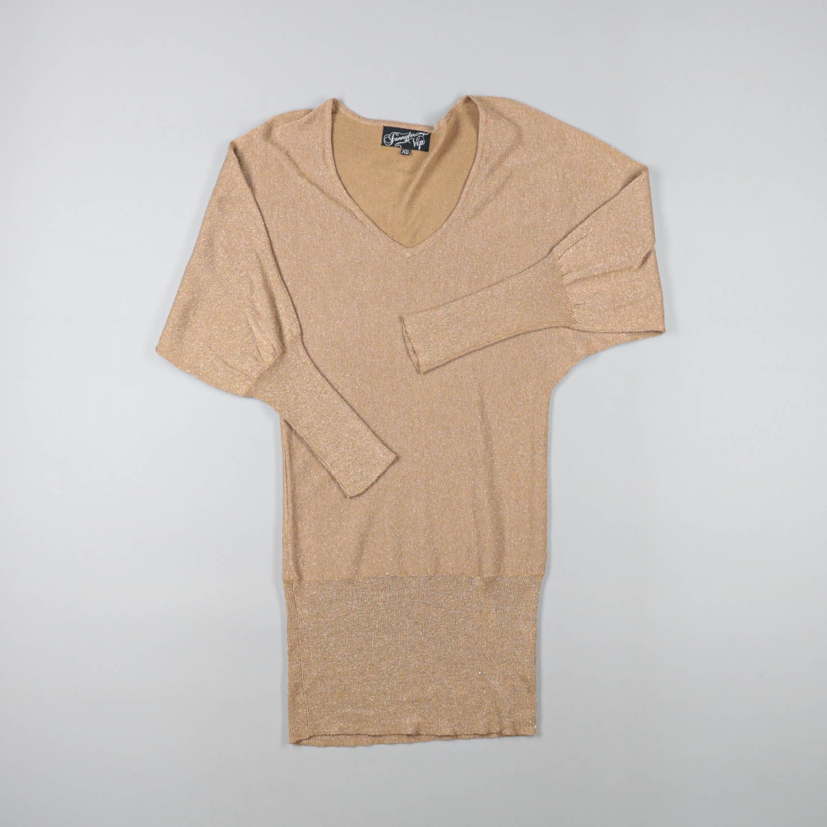 Трикотажное платье-туника с люрексом, бренд не указан. Модель с V-образным вырезом и длинными рукавами, хорошо подойдёт для повседневных выходов и встреч, когда хочется немного блеска без лишней вычурности. Мягкая эластичная ткань комфортно садится по ...