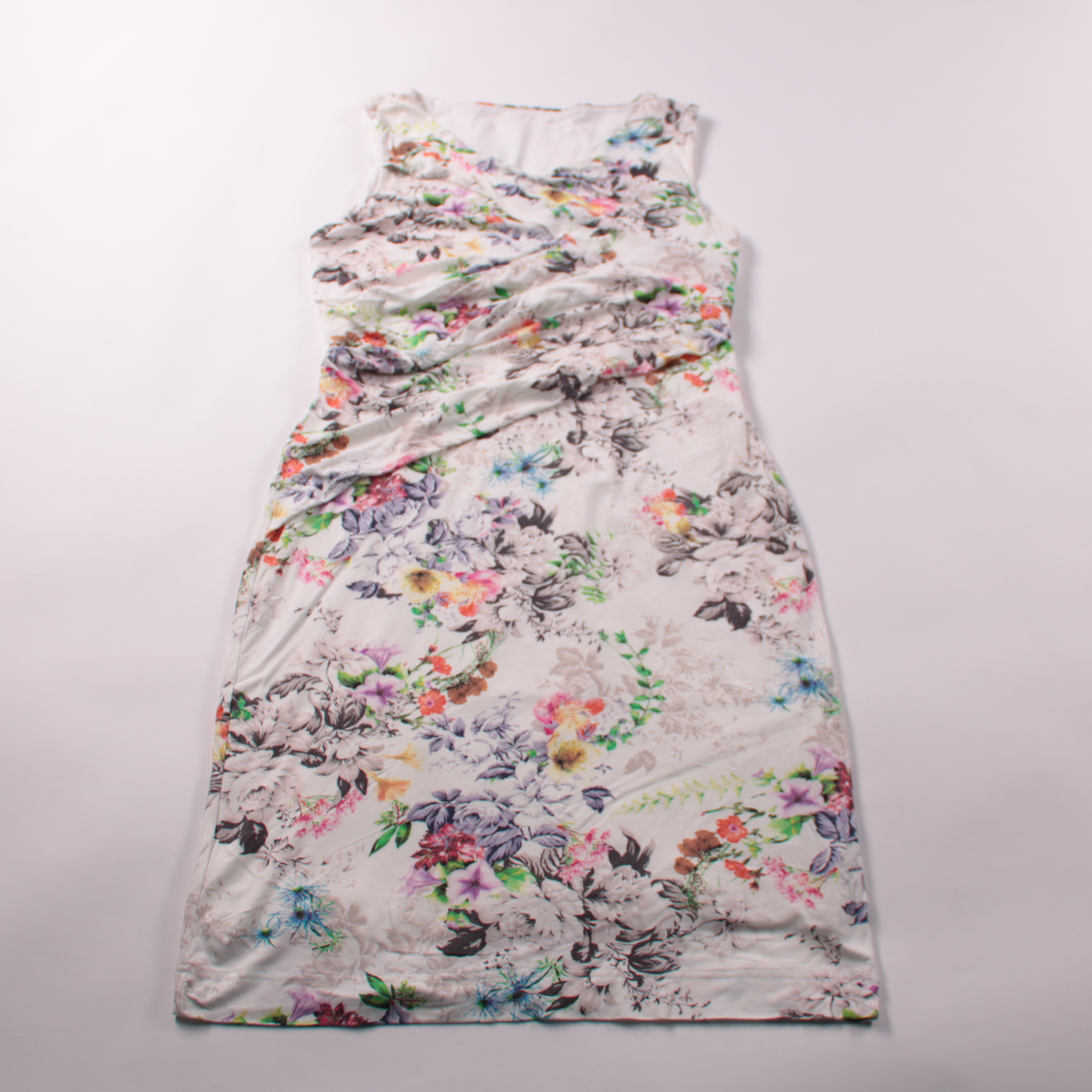 Женское повседневное платье с цветочным принтом на светлой основе и драпировкой в зоне талии. Подойдёт для лета, прогулок и повседневных выходов, хорошо сочетается с сандалиями или кедами. Материал тянется за счёт эластана, поэтому платье комфортно сад...