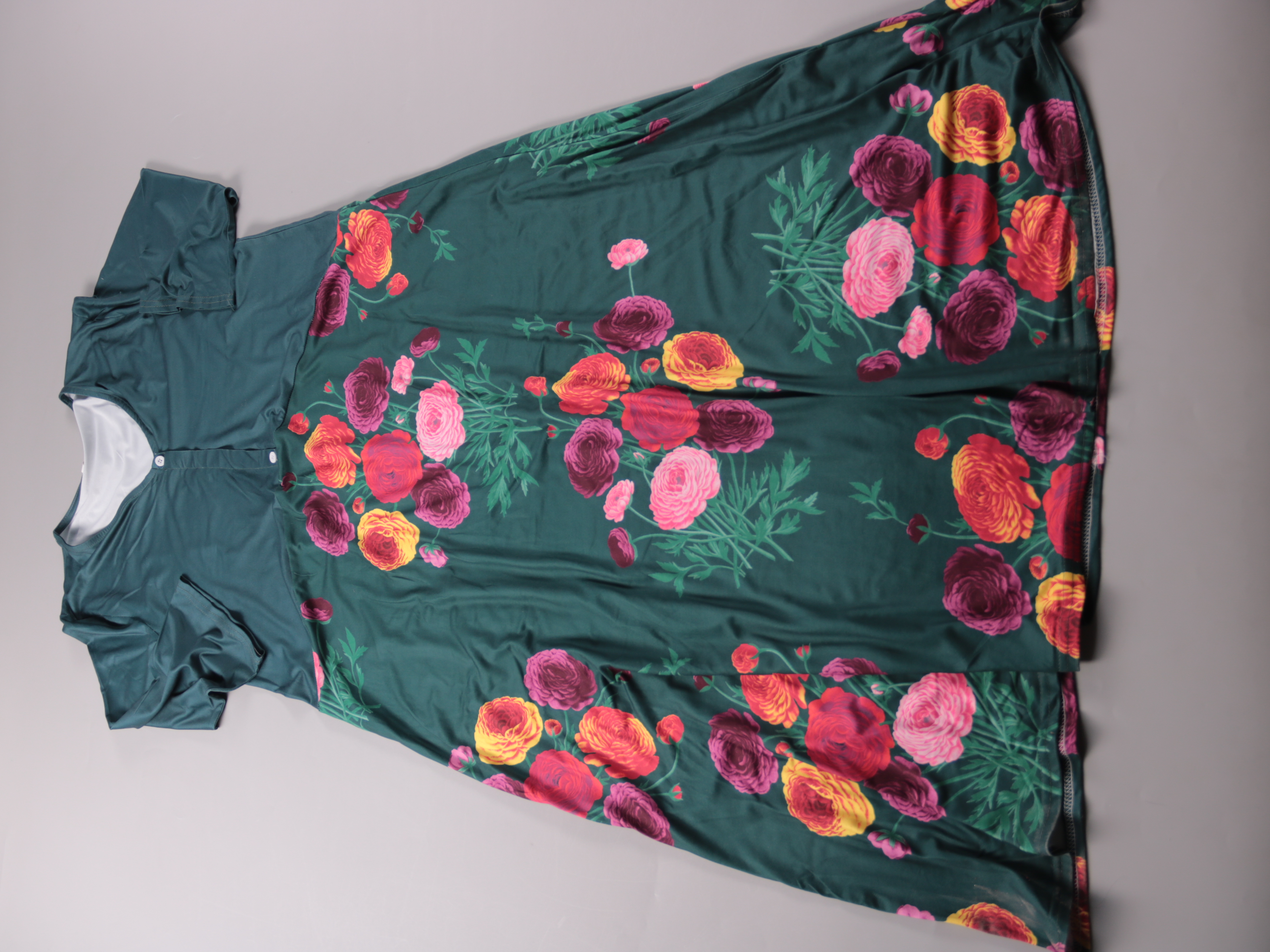 Женское повседневное платье А-силуэта из лёгкого полиэстера, тёмно-зелёного цвета с ярким цветочным принтом. Подойдёт для прогулок и отдыха в тёплую погоду, можно носить с кедами или сандалиями. Материал почти не мнётся и быстро сохнет.