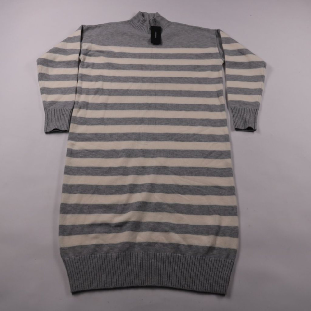 Повседневное трикотажное платье Vero Moda в серо-белую полоску с воротником-стойкой и манжетами. Подойдёт для прогулок и офиса в прохладную погоду, удобно носить с кедами или ботильонами. Трикотаж хорошо тянется и не требует сложного ухода.