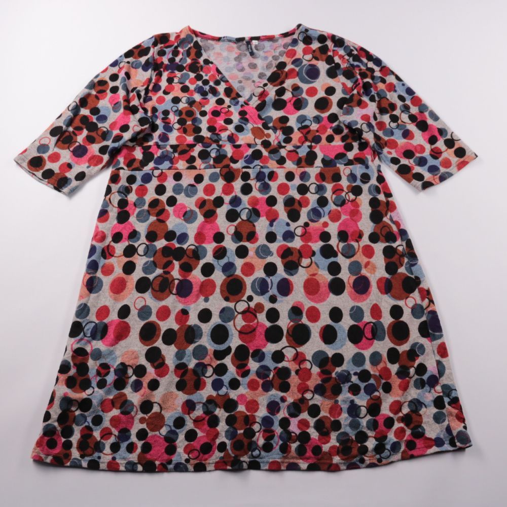 Повседневное платье Papyrus с V-образным вырезом и коротким рукавом, выполнено из трикотажа с ярким принтом в горох. Подойдёт для города и работы в тёплое время или как слой под кардиган в демисезон. Материал тянется и не стесняет движений, удобно в но...