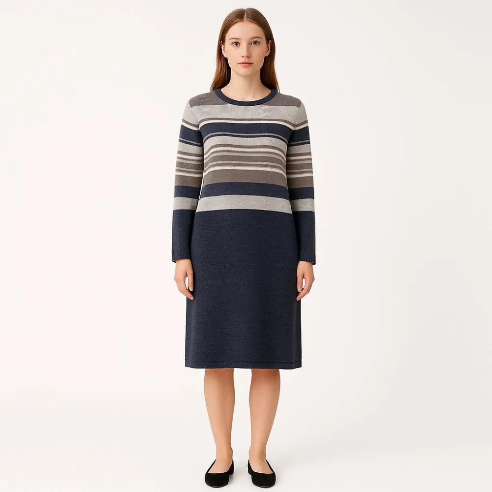Вязаное повседневное платье из 100% акрила с полосатым верхом и прямым силуэтом, длина миди. Подойдёт для офиса и на каждый день в прохладную погоду, хорошо смотрится с балетками или ботинками. Практичный плюс — акрил не мнётся и быстро сохнет после ст...