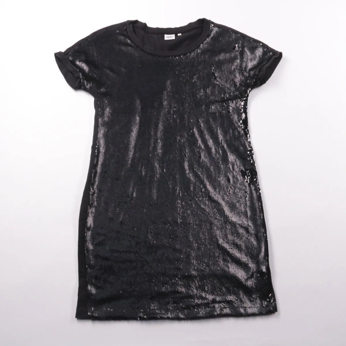 Короткое платье-футболка Object чёрного цвета с пайетками на передней части. Подойдёт для вечерних выходов, праздников и образов в стиле casual с акцентом на блеск. Мягкая трикотажная основа делает посадку комфортной и не сковывает движения.