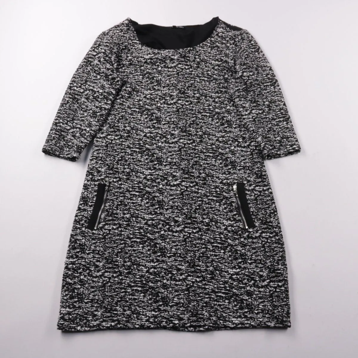 Повседневное платье Norah из фактурного трикотажа в чёрно-белом меланже, рукав 3/4. Подойдёт для офиса и на каждый день, легко сочетается с жакетом и ботильонами. Практичные молнии-карманы добавляют удобства для мелочей.