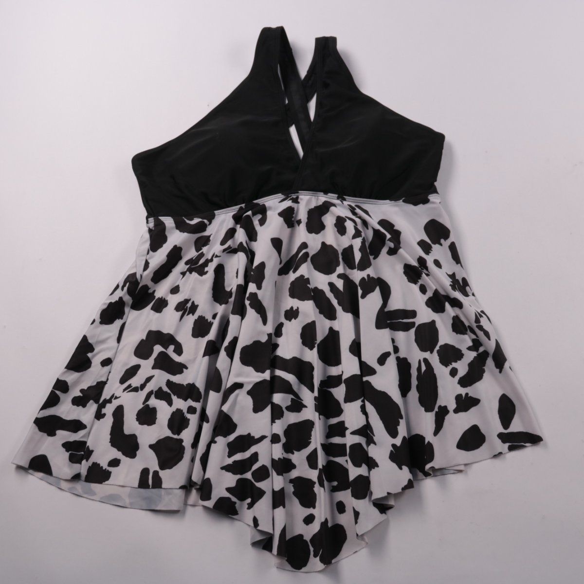 Короткое женское платье с чёрным лифом на бретелях и расклёшенной юбкой с чёрно-белым принтом под «коровку». Подойдёт для летних прогулок, отдыха и повседневных выходов. Ткань эластичная, поэтому платье комфортно садится по фигуре и не стесняет движения.