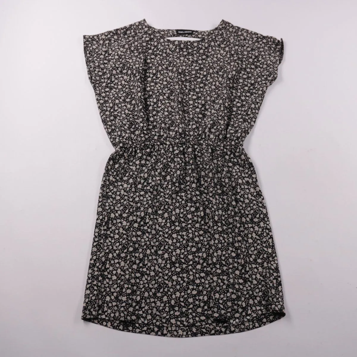Повседневное платье NIELSSON чёрного цвета с мелким цветочным принтом и резинкой на талии. Подойдёт для летних прогулок и на каждый день, легко сочетается с кедами и босоножками. Практичный материал почти не мнётся и быстро сохнет.
