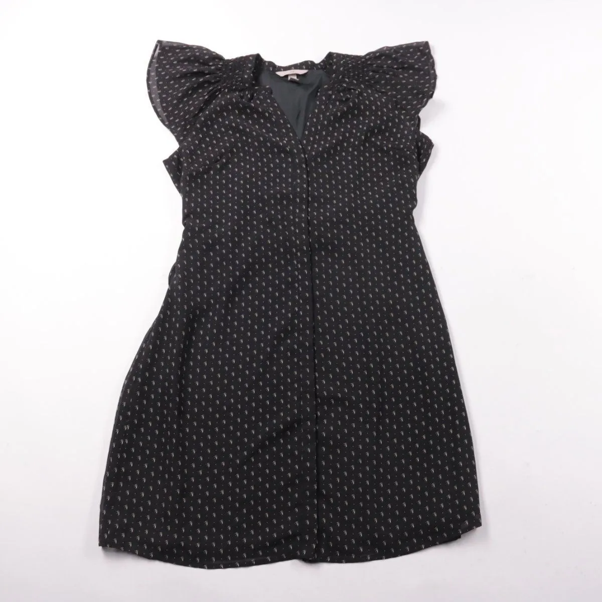 Повседневное платье H&M чёрного цвета с мелким светлым принтом и V-образным вырезом. Модель с короткими рукавами-воланами подойдёт для лета и тёплой погоды в городе. Есть подкладка, поэтому ткань не просвечивает.