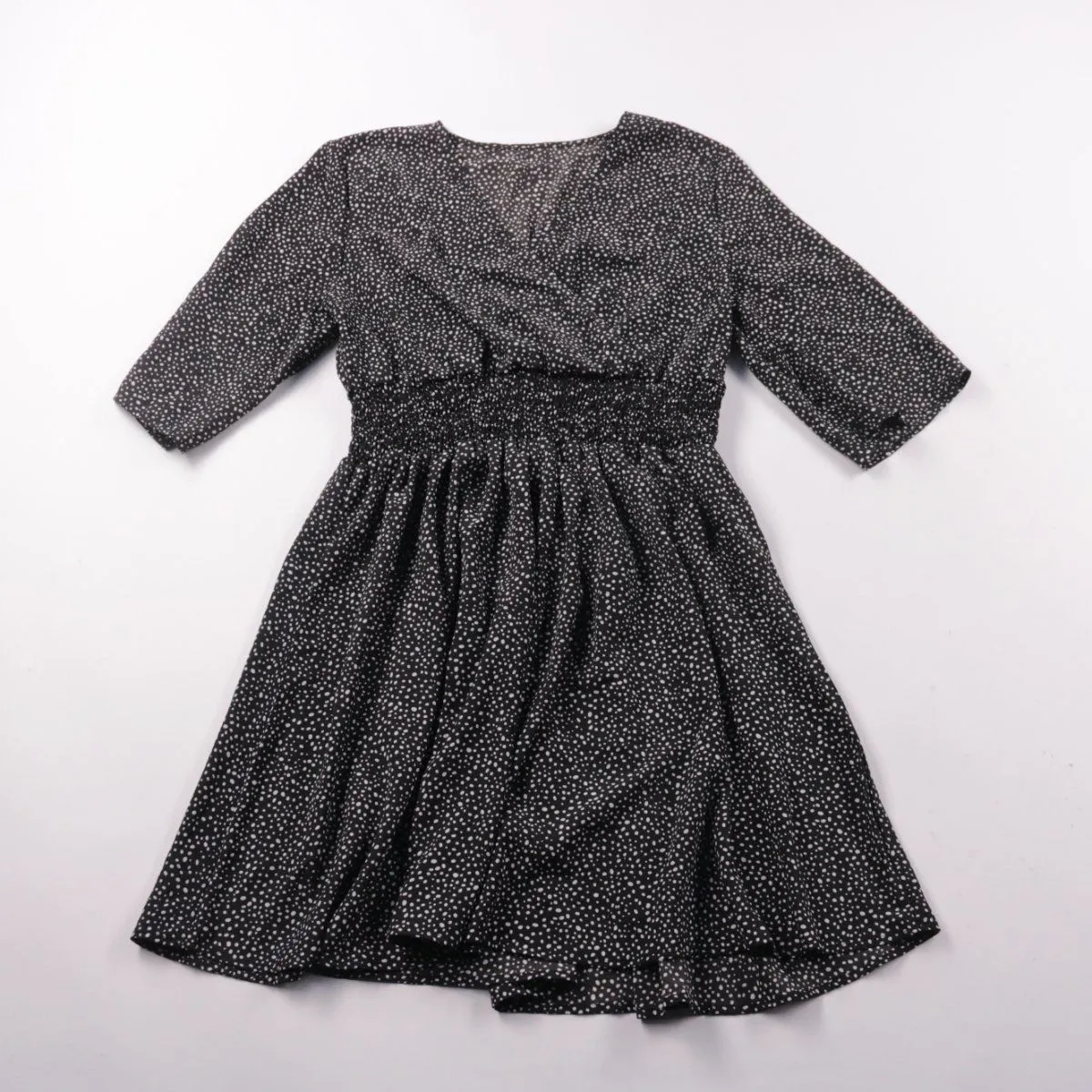 Женское повседневное платье чёрного цвета с мелким белым принтом, с V-образным запахом и рукавами 3/4. Подойдёт для офиса и прогулок благодаря эластичной сборке на талии и свободной юбке. Практичное преимущество — ткань почти не мнётся и легко сочетается с базовой обувью.