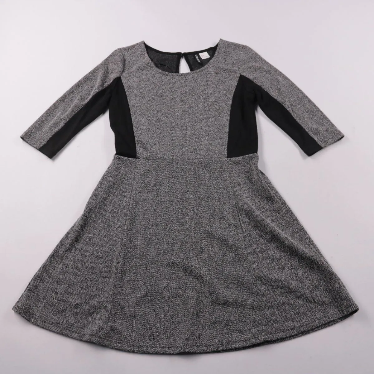 Повседневное платье H&M Divided в сером меланже с чёрными боковыми вставками и рукавами 3/4, приталенный верх и расклёшенная юбка. Подойдёт для офиса и на каждый день в прохладную погоду. Плотная ткань держит форму и выглядит аккуратно.