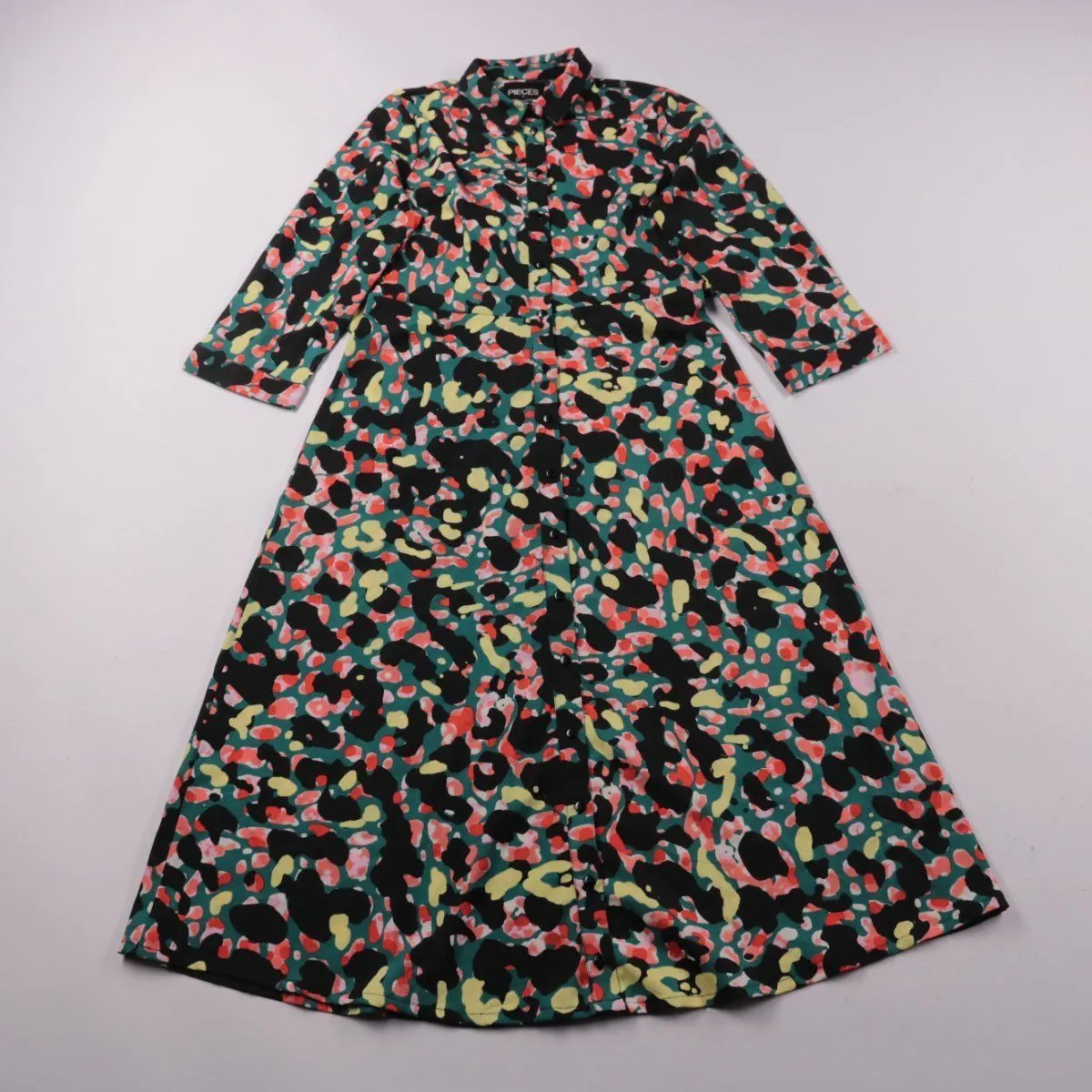 Повседневное платье-рубашка PIECES с абстрактным разноцветным принтом и рукавом 3/4. Подойдёт для тёплой весны и лета, на каждый день и для прогулок. Практично тем, что застёгивается на пуговицы и комфортно садится по фигуре.