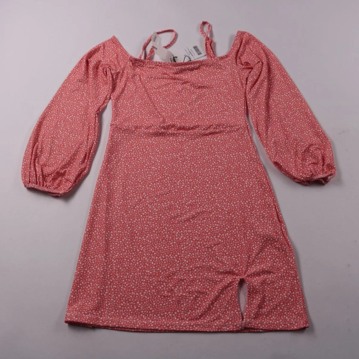 Повседневное платье NA-KD с квадратным вырезом и объёмными рукавами на резинке, розового цвета с мелким белым принтом. Подойдёт для прогулок и встреч в городе, хорошо смотрится с кедами или босоножками. Эластичная ткань комфортно садится по фигуре и проста в уходе.