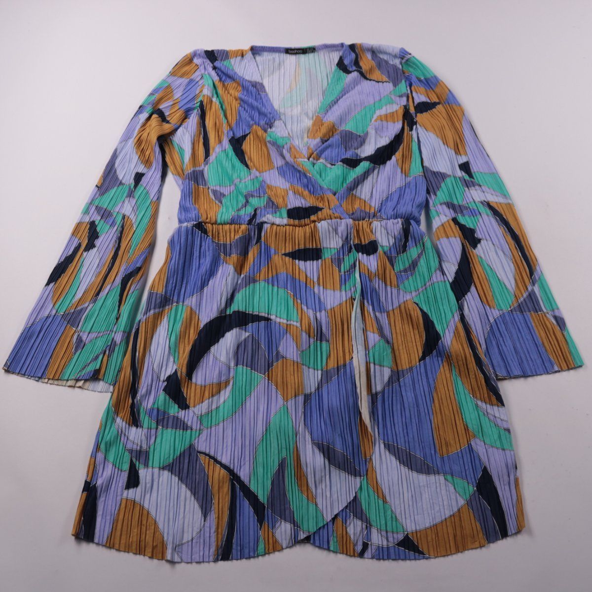 Повседневное плиссированное платье boohoo с V-образным вырезом и ярким абстрактным принтом. Подойдёт для прогулок и повседневных образов, благодаря эластичной талии комфортно садится по фигуре. Лёгкий полиэстер практичен в уходе и быстро сохнет.
