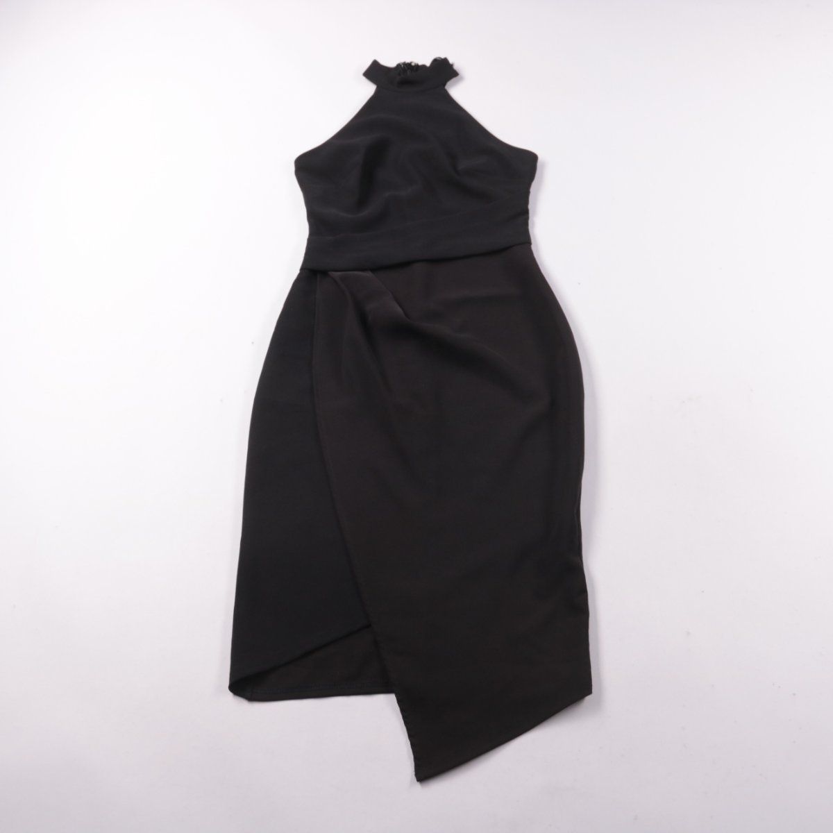 Вечернее платье Lipsy London чёрного цвета с воротником-халтер и акцентом на талии. Подойдёт для коктейльных мероприятий и выходов, асимметричный запах визуально вытягивает силуэт. Плотная ткань с эластаном лучше держит форму и комфортно садится по фигуре.