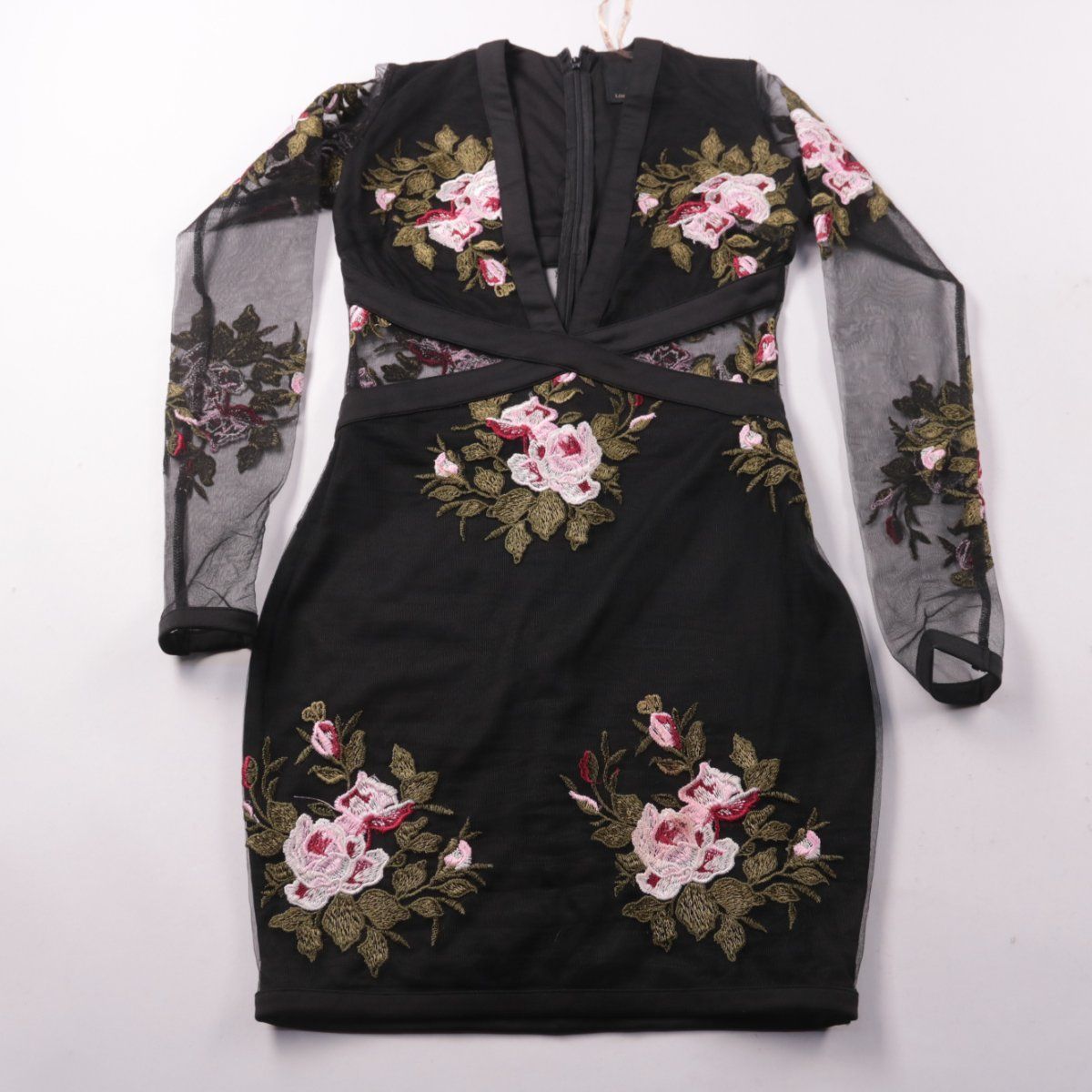 Вечернее платье Rare London в чёрном цвете с цветочной вышивкой и прозрачными рукавами из сетки. Приталенный силуэт и глубокий V-образный вырез подойдут для вечеринки или выхода. Есть подкладка и застёжка-молния сзади, за счёт чего платье удобнее носить.