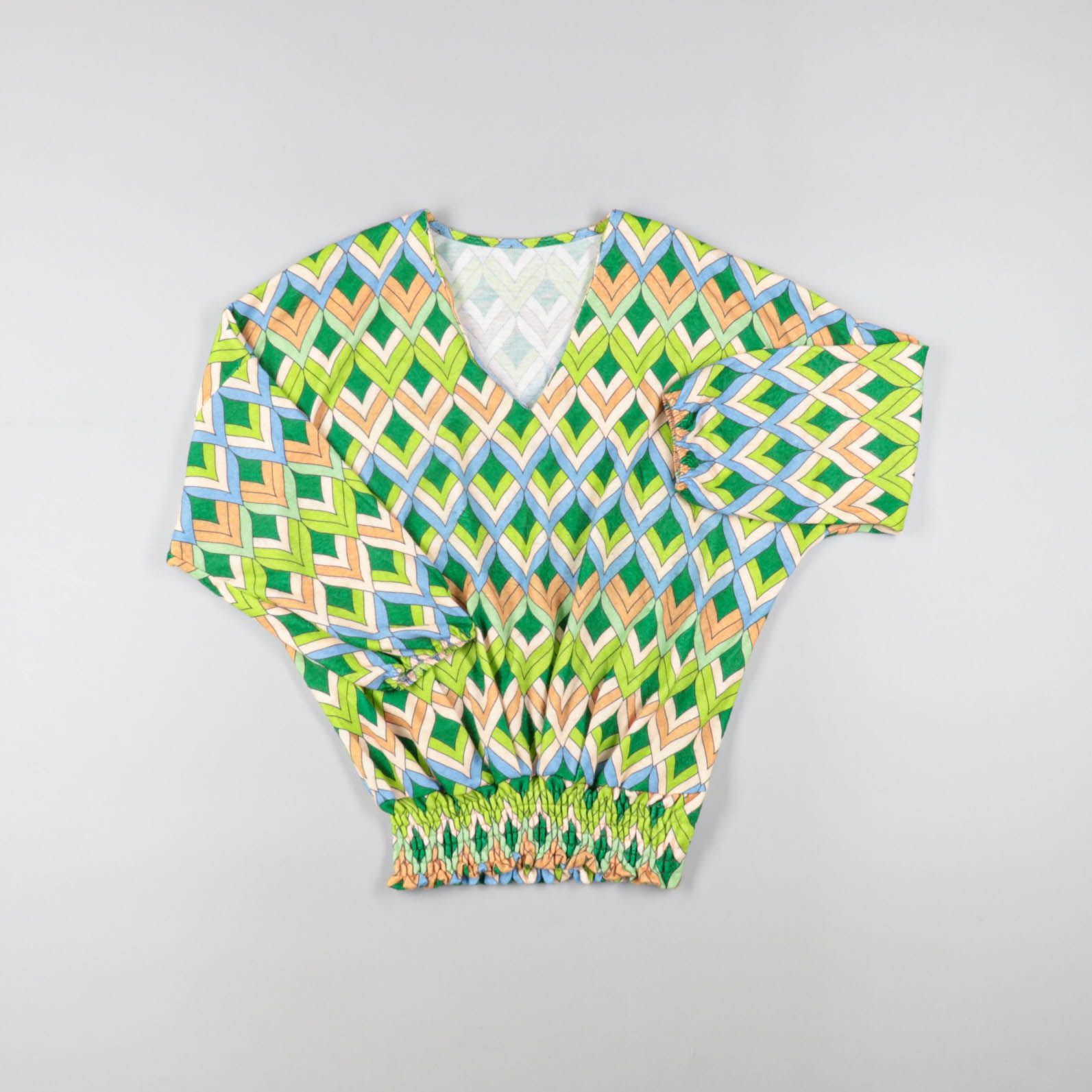 Женская блузка с V-образным вырезом и ярким геометрическим принтом в зелёно-голубых тонах. Подойдёт для летних прогулок и отпуска, хорошо сочетается с однотонными шортами или джинсами. Эластичная сборка по низу и на рукавах комфортно фиксирует посадку.