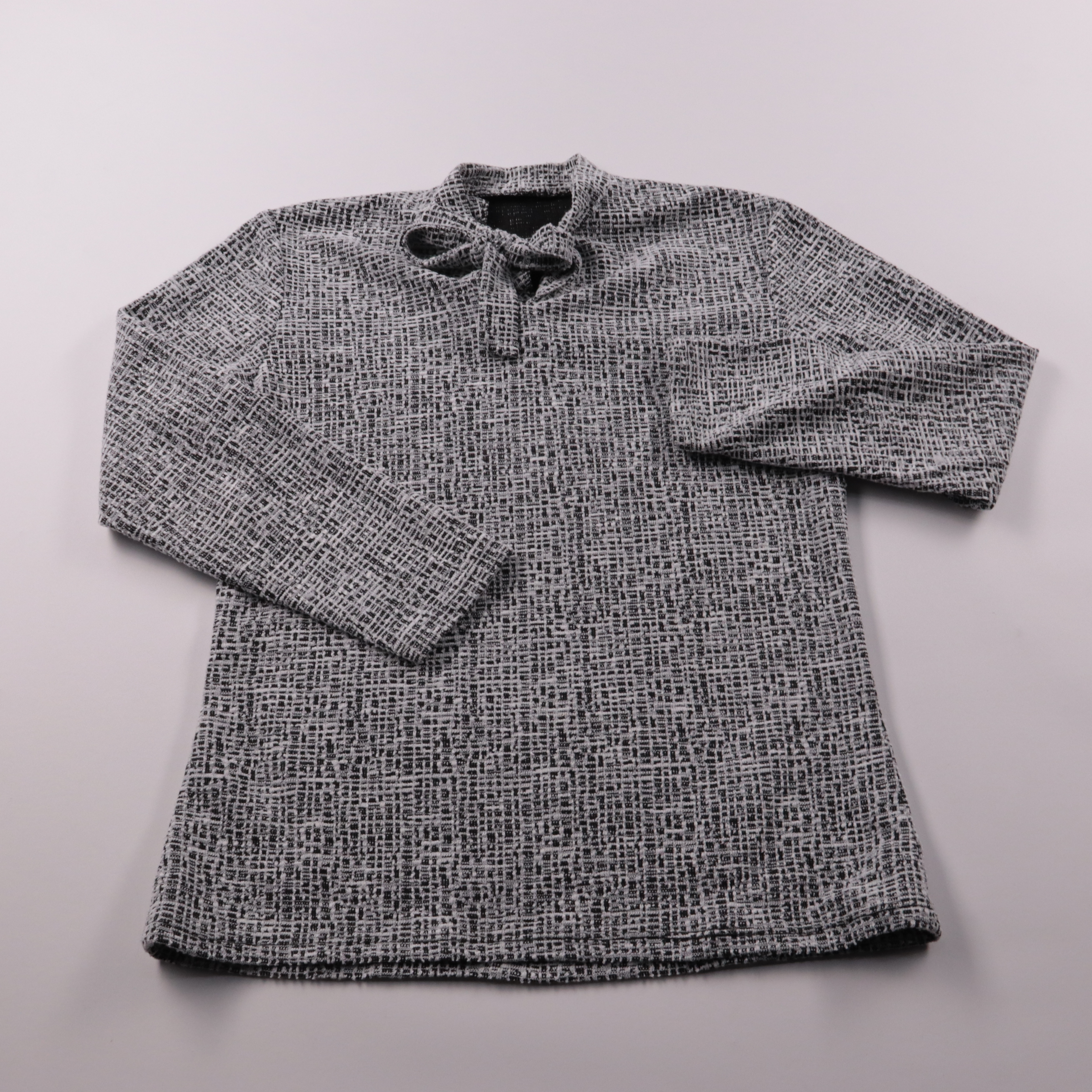 Блузка из фактурной ткани в чёрно-белом меланже, с декоративным бантом у горловины. Подойдёт для офиса и повседневных образов в демисезон, хорошо сочетается с однотонными брюками или юбкой. Плотный материал держит форму и меньше мнётся.