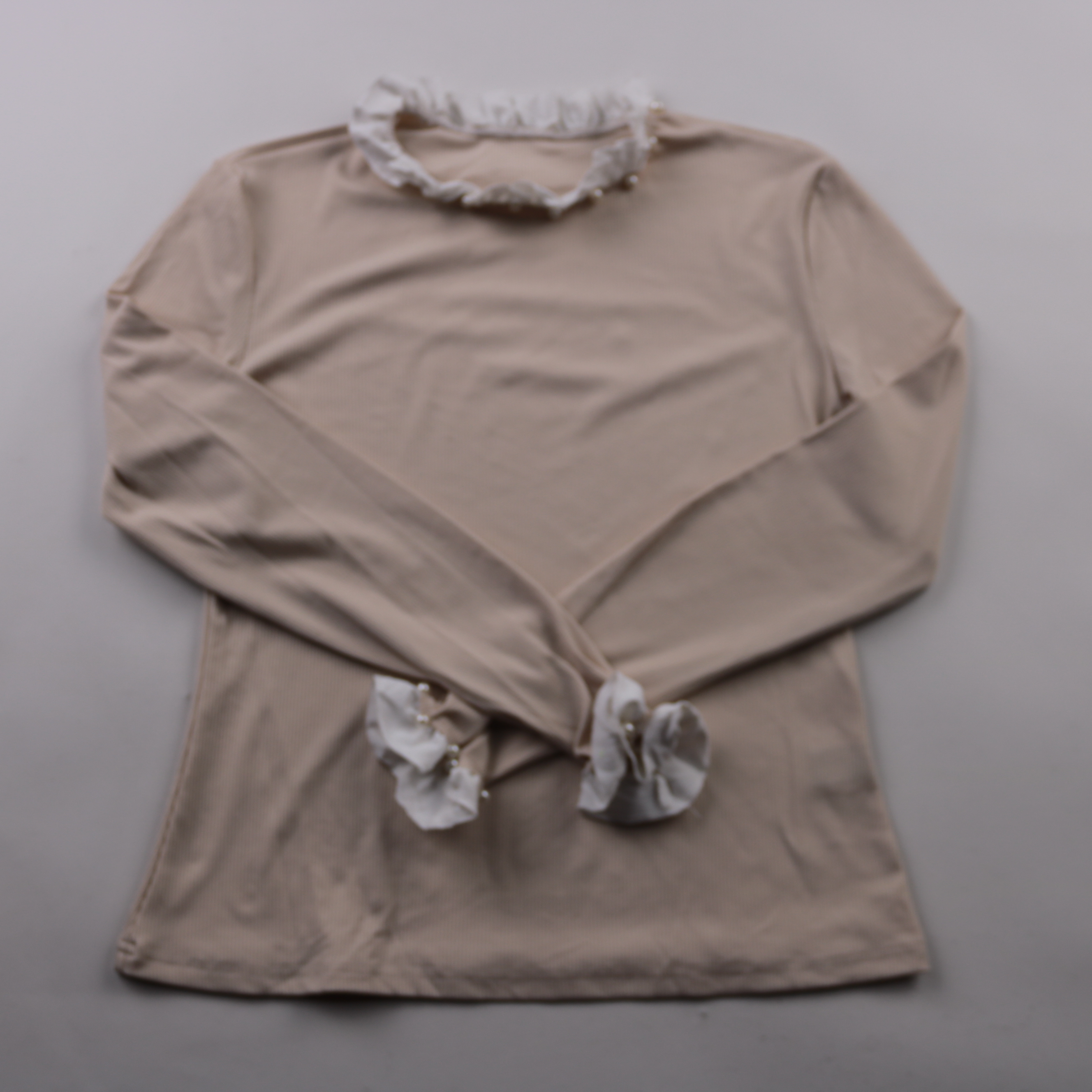 Блузка Shein в бежевом цвете из мягкого эластичного трикотажа с рюшами на горловине и манжетах. Подойдёт для повседневных и офисных образов, красиво смотрится как с джинсами, так и с юбкой. Ткань хорошо тянется и комфортно садится по фигуре.
