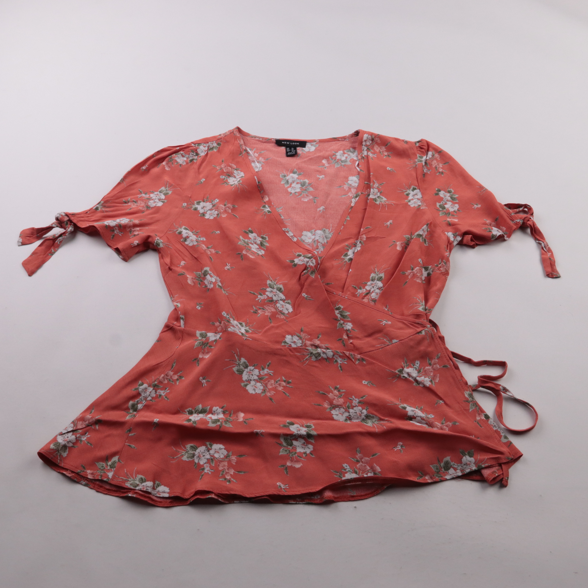 Лёгкая блузка New Look кораллового цвета с цветочным принтом и запахом, с завязками на рукавах и по боку. Подойдёт для лета и тёплой весны, хорошо смотрится с джинсами или шортами. Вискоза приятная к телу и хорошо дышит в жару.