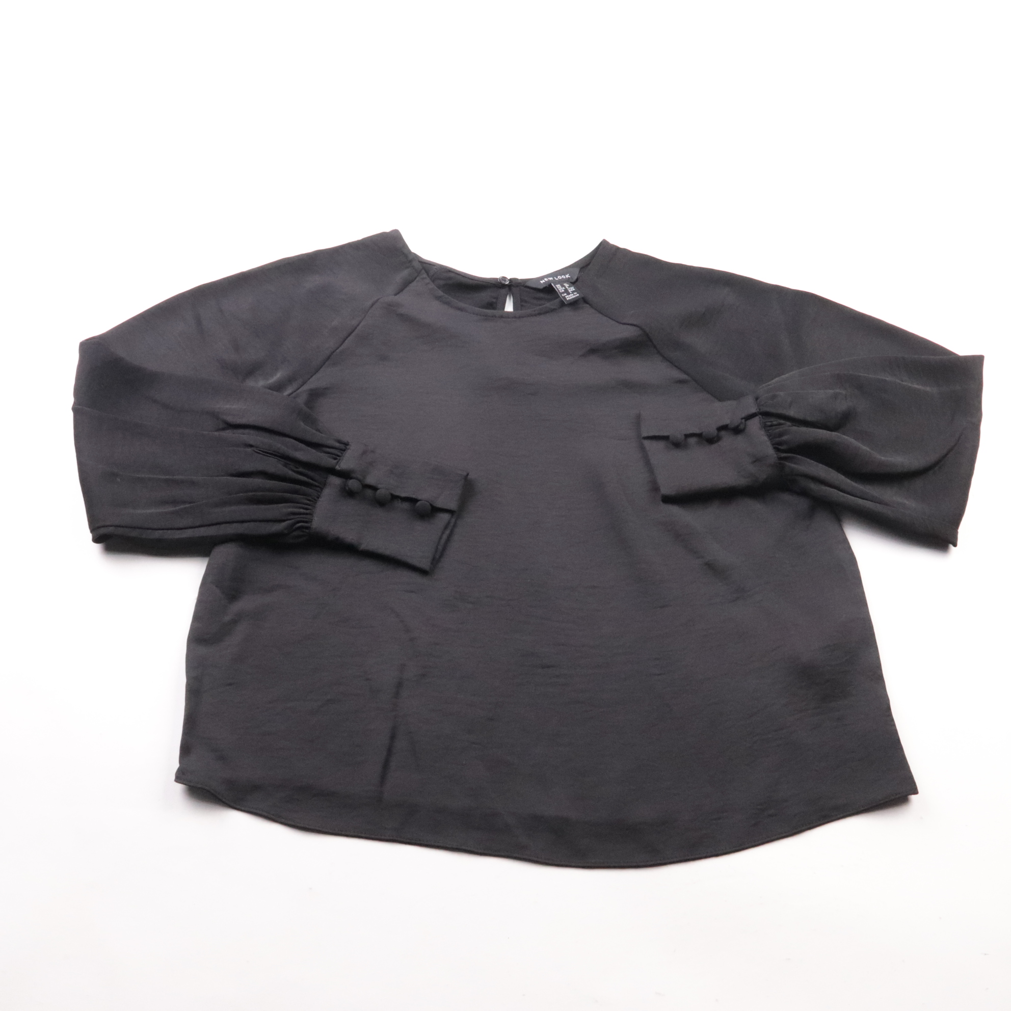 Чёрная блузка New Look из плотного полиэстера с объёмными рукавами 3/4 и декоративными пуговицами на манжетах. Подойдёт для офиса, учёбы и вечера — легко сочетается с брюками и юбками. Материал почти не мнётся и быстро сохнет.