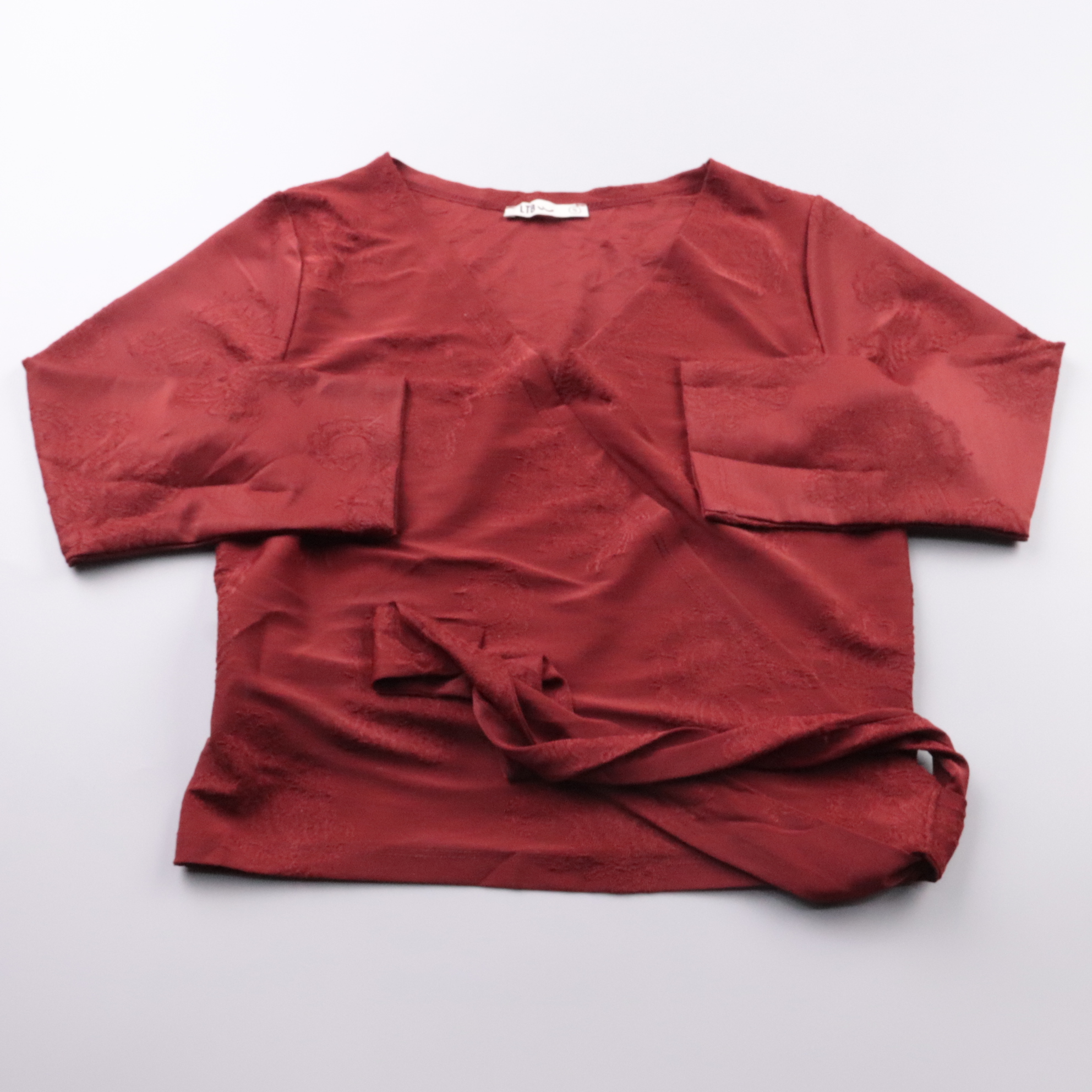 Блузка LTB бордового цвета с V-образным вырезом и рукавом 3/4, ткань с жаккардовым рисунком. Подойдёт для офиса и на выход, хорошо сочетается с юбкой или брюками. Материал почти не мнётся и быстро сохнет.