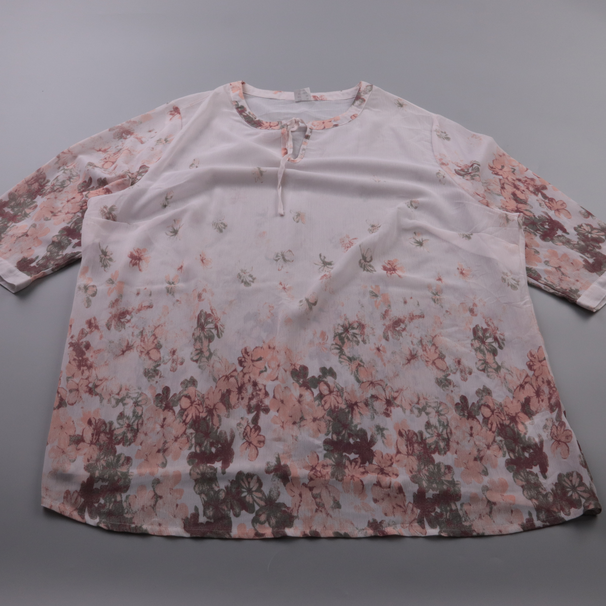 Лёгкая блузка Dinl из полупрозрачного полиэстера с цветочным принтом и завязками у горловины. Подойдёт для тёплой погоды и аккуратных повседневных образов с топом/майкой. Ткань почти не мнётся и быстро сохнет.