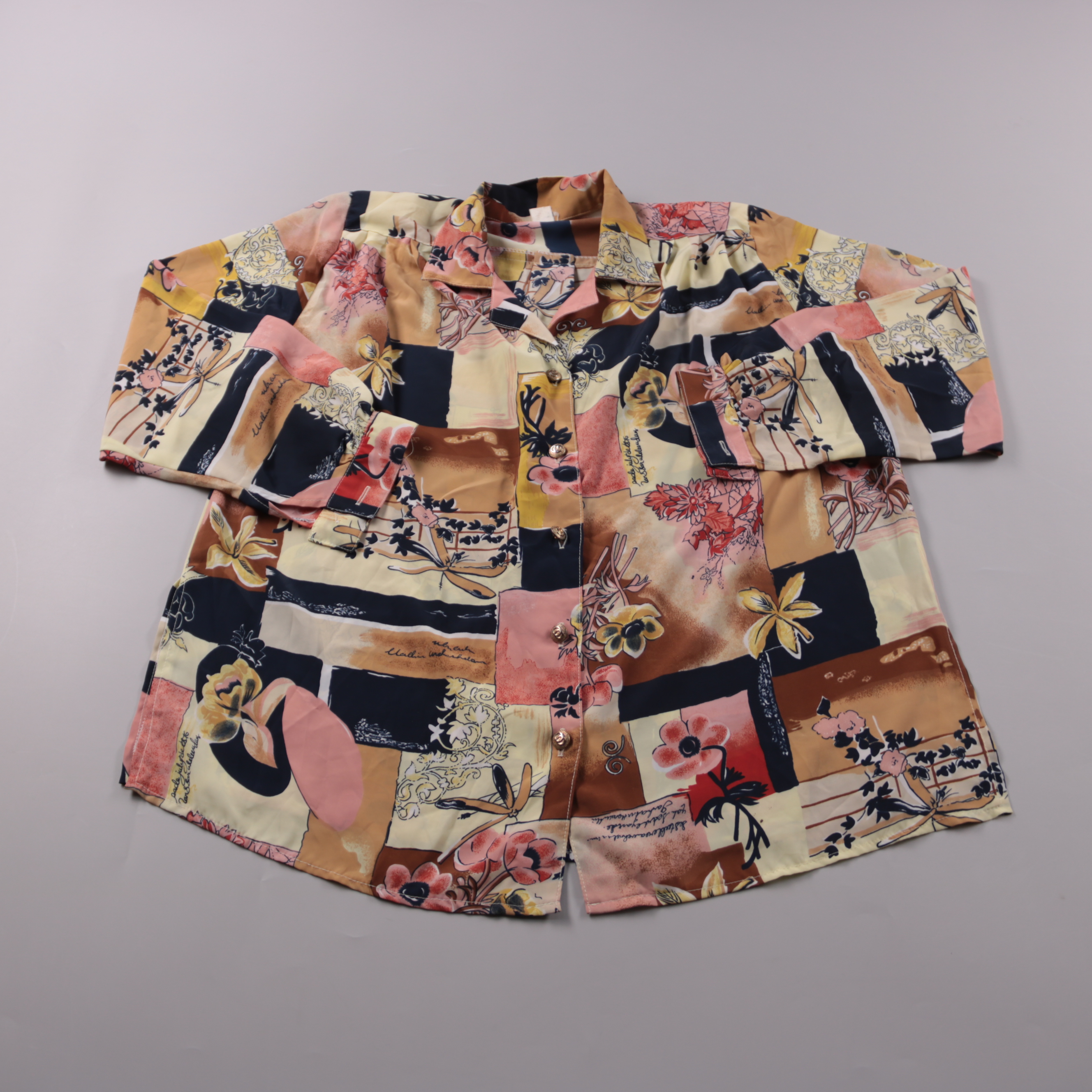 Женская блузка с ярким принтом в стиле пэчворк, на пуговицах и с воротником. Подойдёт для повседневных летних образов и отпуска, хорошо сочетается с однотонными брюками или юбкой. Лёгкая ткань комфортна в жару и быстро сохнет после стирки.