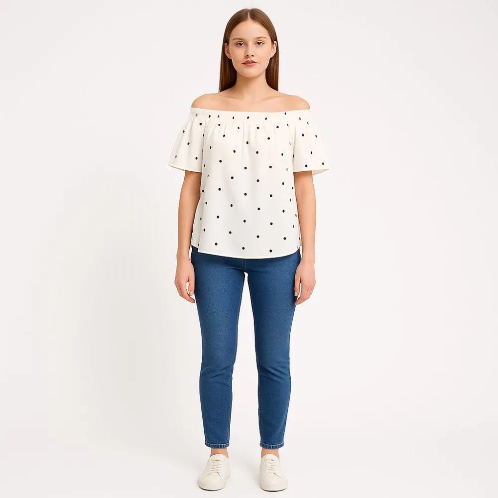 Женская блузка с открытыми плечами и коротким рукавом, белая в чёрный горох. Подойдёт для летних прогулок и отпуска, хорошо смотрится с джинсами и юбками. Эластичная горловина удобно держится и не сковывает движения.