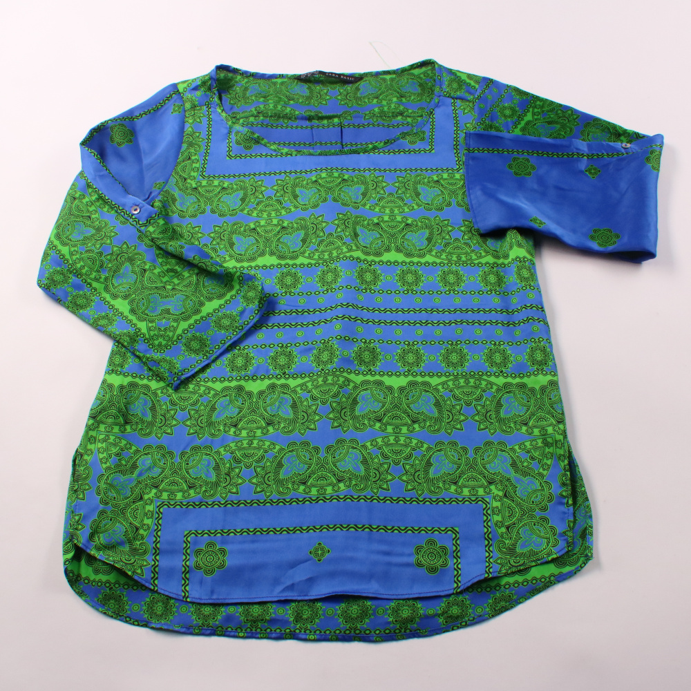 Блузка Zara Basic с ярким зелёным орнаментом на синем фоне и рукавом 3/4. Подойдёт для повседневных образов и офиса без строгого дресс-кода, хорошо сочетается с однотонными брюками или джинсами. Лёгкая ткань почти не мнётся и быстро сохнет.