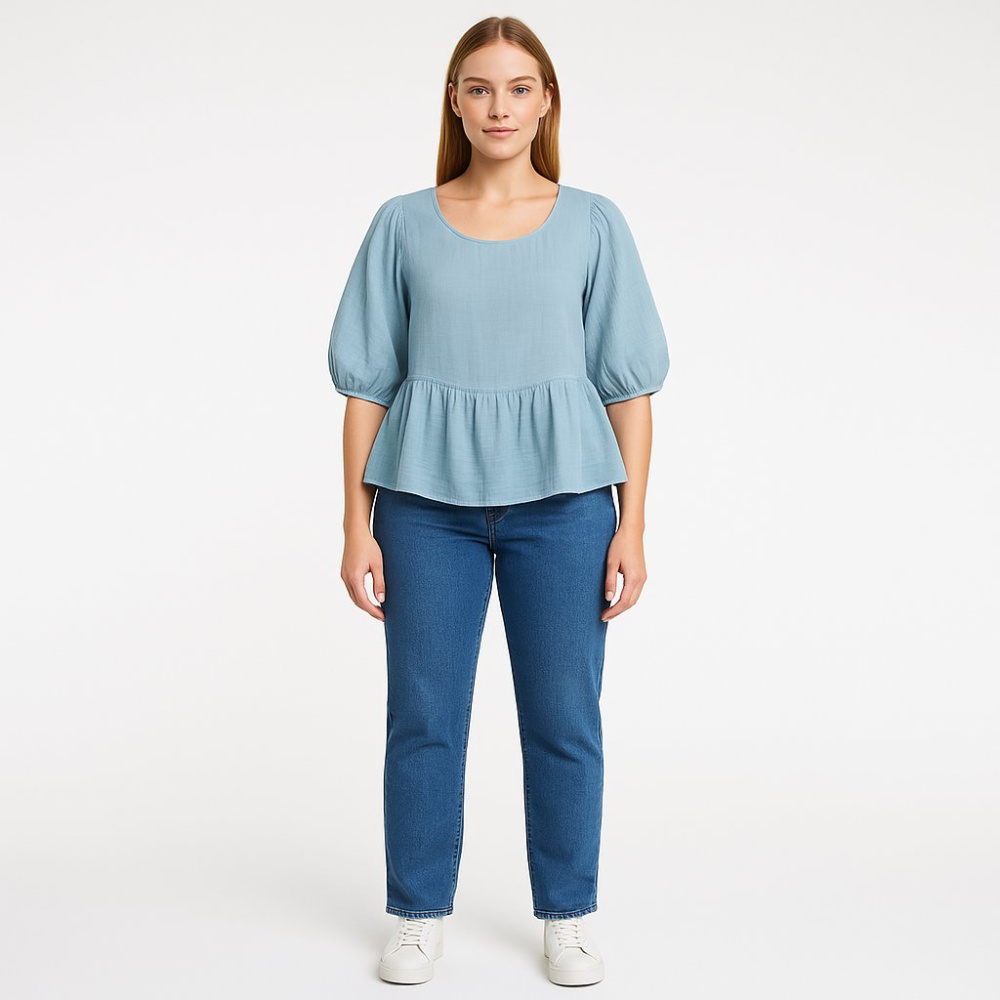 Женская блузка свободного кроя из лёгкой ткани с круглым вырезом и рукавами-фонариками 3/4. Подойдёт для повседневных образов и офиса в сочетании с джинсами или брюками. Практичное преимущество — не сковывает движения и хорошо смотрится навыпуск.