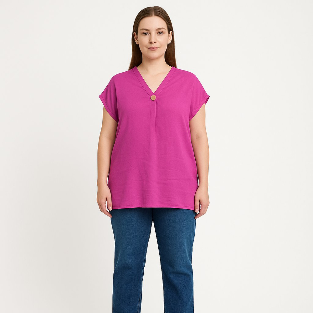 Женская блузка Laura Torelli Collection ярко-розового цвета с V-образным вырезом и коротким рукавом. Подойдёт для повседневных образов и офиса в тёплое время года, легко сочетается с джинсами и брюками. Практичный плюс — лёгкая ткань и свободная посадк...