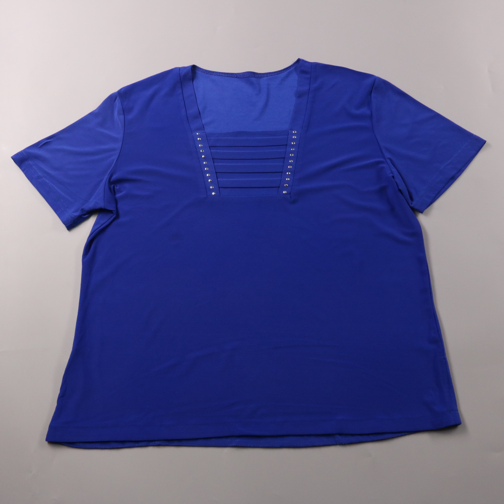 Женская блузка насыщенного синего цвета с коротким рукавом и V‑образным вырезом, декорированным складками и небольшими заклёпками. Подойдёт для офиса и повседневных образов, хорошо смотрится с брюками или юбкой. Лёгкая ткань почти не мнётся и быстро со...