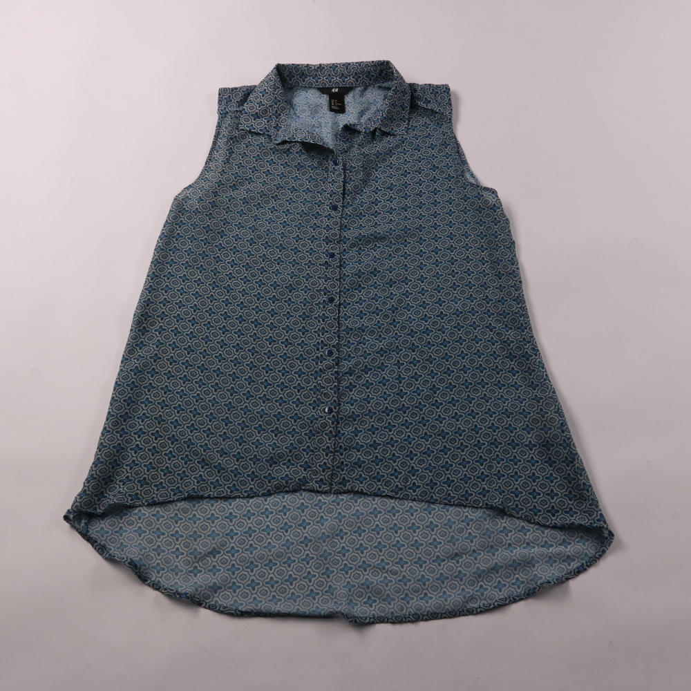 Женская блузка H&M без рукавов с отложным воротником и геометрическим принтом в сине-голубых оттенках. Подойдёт для лета и тёплой погоды, удобно носить как самостоятельный верх или под жакет. Лёгкая ткань из полиэстера быстро сохнет и почти не мнётся.