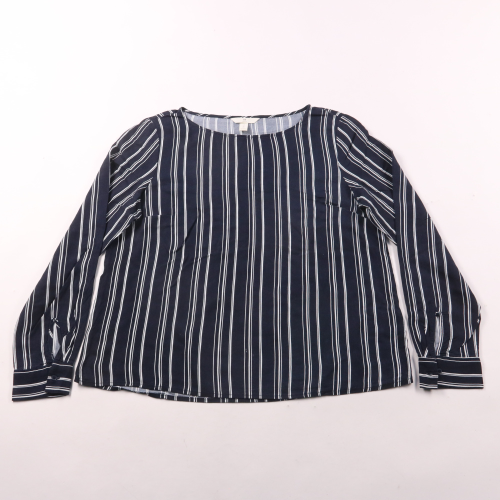 Блузка H&M L.O.G.G. тёмно-синего цвета в белую вертикальную полоску, с круглым вырезом и длинными рукавами на манжетах. Подойдёт для офиса и на каждый день, легко сочетается с джинсами и брюками. Вискоза приятна к телу и хорошо драпируется.