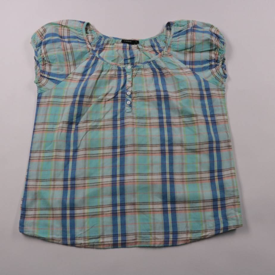 Женская блузка Lindex в клетку, лёгкая и свободная, с коротким рукавом-фонариком и планкой на пуговицах. Подойдёт для повседневных образов летом и в тёплую погоду, хорошо смотрится с джинсами или шортами. Практичный плюс — тонкая ткань комфортна в жару...