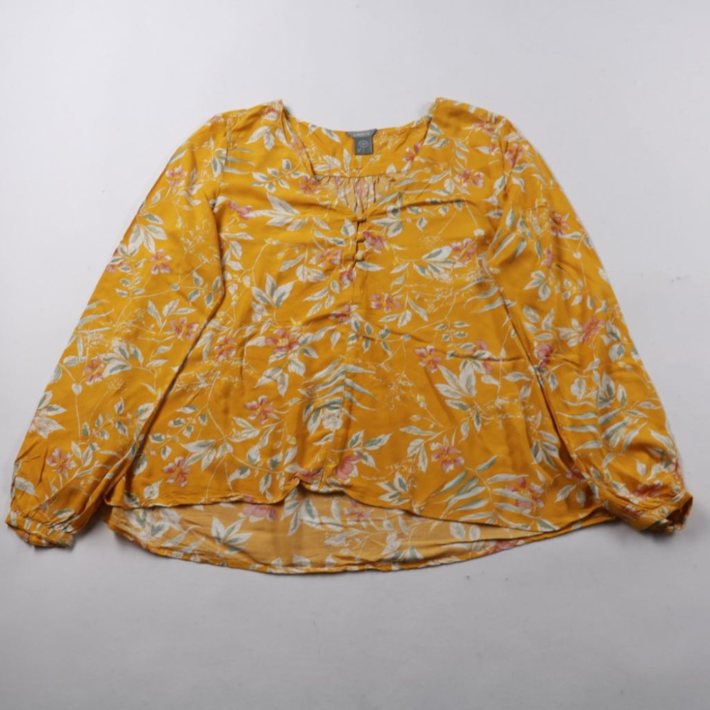Женская блузка Lindex горчичного цвета с цветочным принтом и длинными рукавами на манжетах. Подойдёт для повседневных образов и офиса в сочетании с джинсами или юбкой. Вискоза приятна к телу и хорошо драпируется.