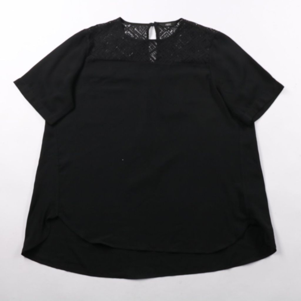 Черная блузка Next с коротким рукавом и кружевной вставкой в верхней части. Подойдет для офиса и вечера, хорошо сочетается с юбкой или брюками. Легкий полиэстер почти не мнется и быстро сохнет.