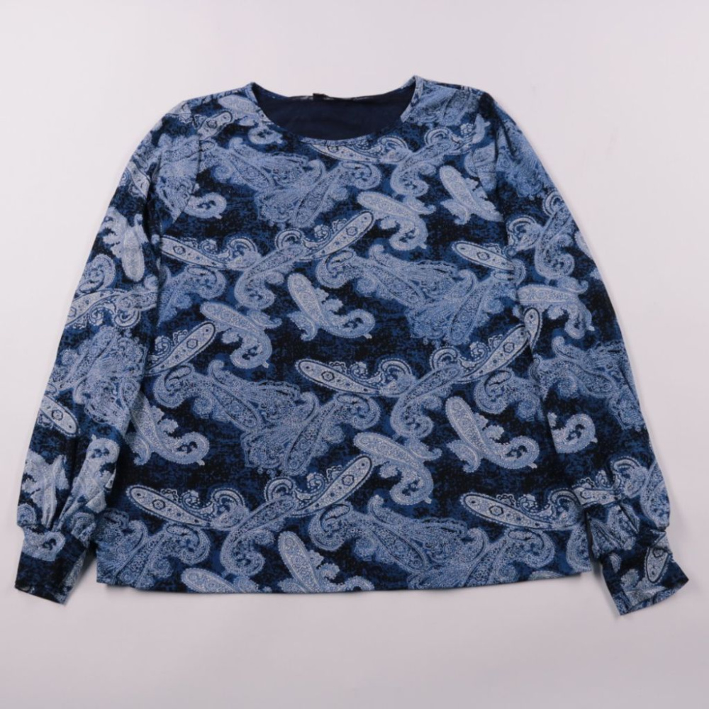 Блузка Norah с длинным рукавом и круглым вырезом, выполнена в синем цвете с принтом пейсли. Подойдёт для повседневных образов и офиса с базовыми брюками или юбкой. Лёгкая нейлоновая ткань и подкладка быстро сохнут и просты в уходе.