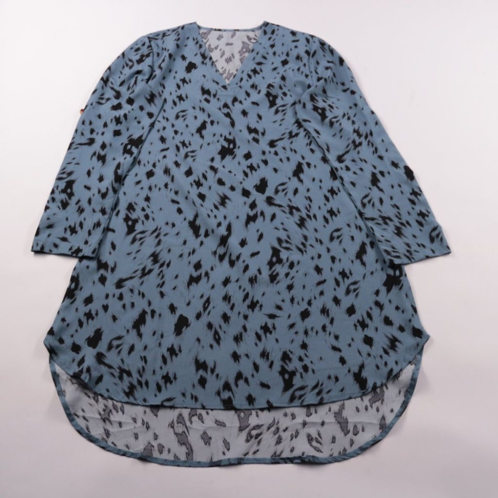 Женская блузка Shein голубого цвета с чёрным пятнистым принтом и V‑образным вырезом. Удлинённая спинка и свободная посадка делают её удобной для образов на каждый день и для офиса. Лёгкая ткань почти не мнётся и быстро сохнет.