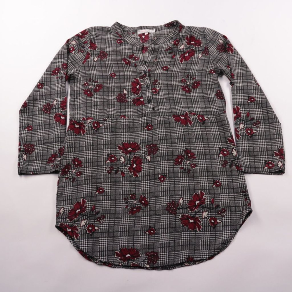 Блузка LolaLiza в серую клетку с бордовым цветочным принтом и длинным рукавом. Подойдёт для офиса и на каждый день, хорошо смотрится с джинсами и юбкой. Практичный вариант: немаркая расцветка и свободный крой не сковывает движения.