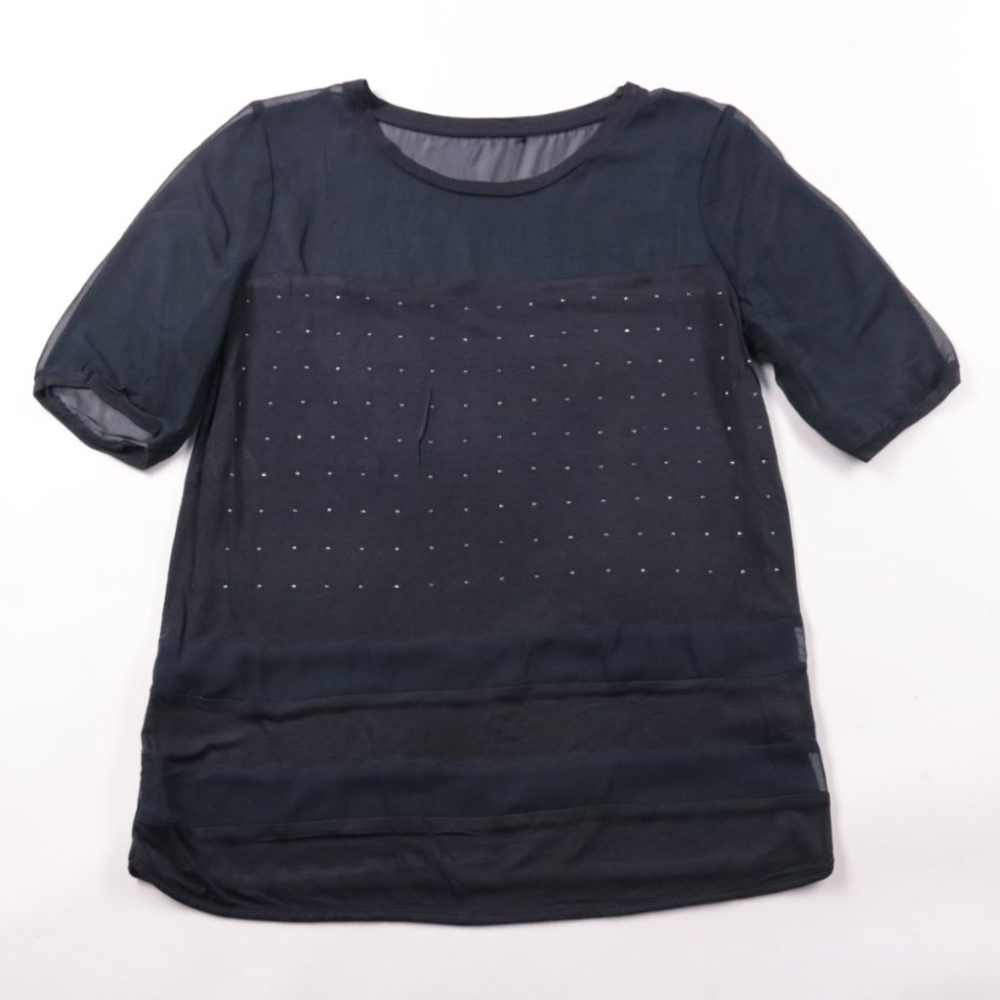 Женская блузка без указанного бренда, чёрного цвета, с полупрозрачными рукавами и декоративными точками спереди. Подойдёт для офиса и вечера, хорошо сочетается с брюками или юбкой. Лёгкая ткань почти не мнётся и удобно носится в течение дня.