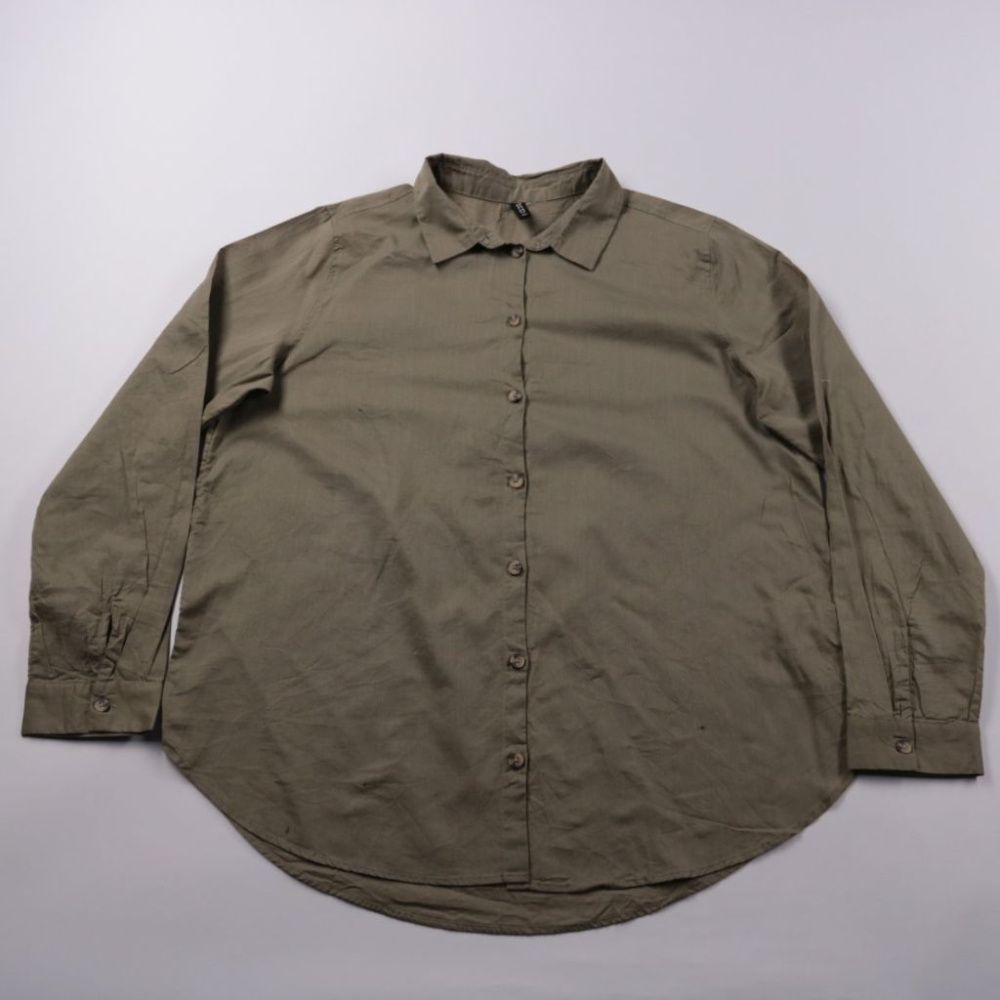 Женская рубашка H&M цвета хаки на пуговицах, с длинным рукавом и классическим воротником. Подойдёт для повседневных и офисных образов в демисезон и круглый год, хорошо сочетается с джинсами и брюками. Натуральный хлопок приятен к телу и дышит.