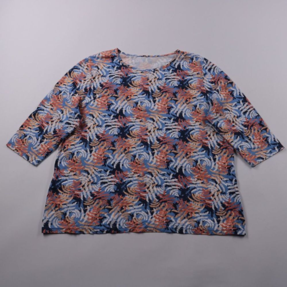 Женская блузка с абстрактным принтом в сине-голубых и терракотовых оттенках, рукав 3/4 и круглый вырез. Подойдёт для повседневных образов и офиса без строгого дресс-кода, хорошо сочетается с однотонным низом. Практична тем, что ткань выглядит немаркой ...