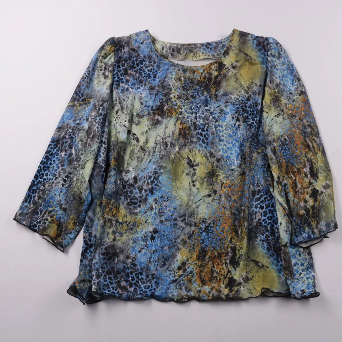 Женская блузка с абстрактным разноцветным принтом в сине-зелёной гамме и длинными рукавами. Подойдёт для повседневных образов и офиса, хорошо сочетается с однотонными брюками или юбкой. Лёгкая ткань и свободный крой обеспечивают комфорт в течение дня.