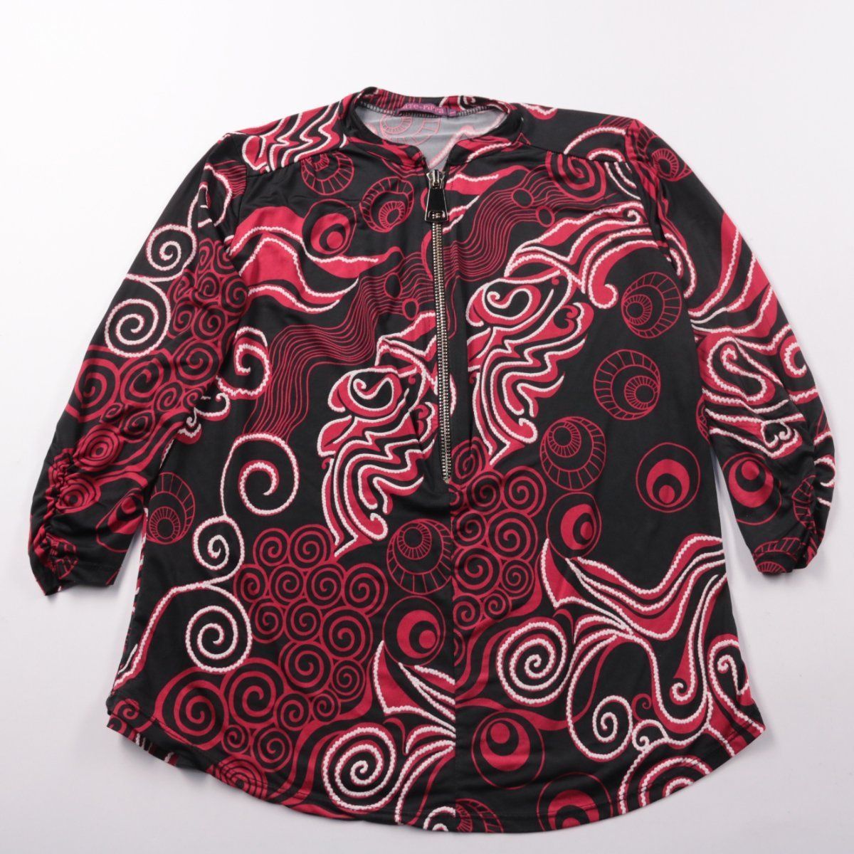 Блузка Kate+Pippa с ярким абстрактным принтом и застёжкой-молнией у горловины, рукава 3/4 на сборке. Подойдёт для повседневных образов и офисного кэжуала с однотонными брюками или джинсами. Практичная ткань почти не мнётся и легко сочетается с базовыми вещами.