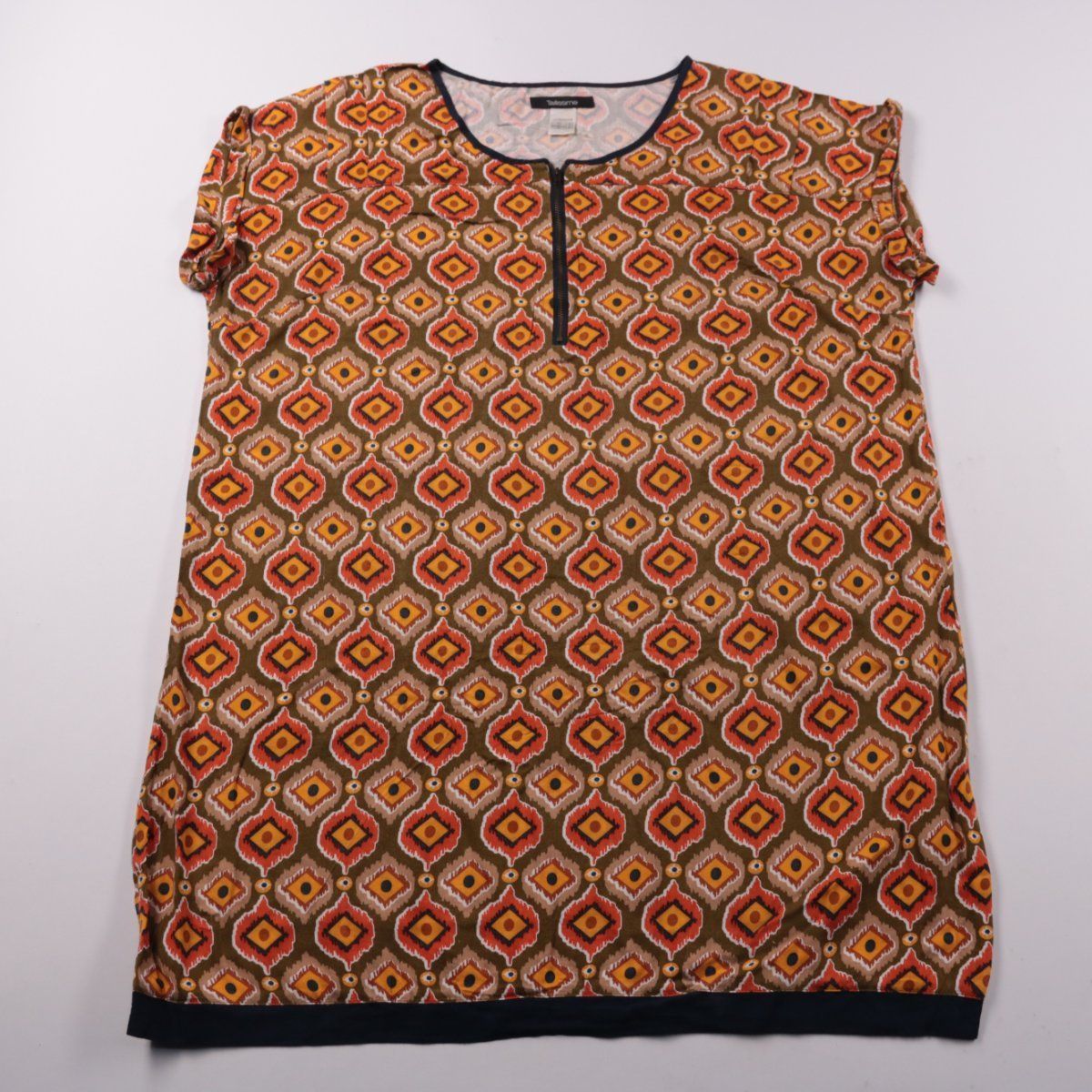Блузка Taillissime (La Redoute) с геометрическим принтом и коротким рукавом, по горловине небольшая молния. Подойдёт для повседневных образов и офиса в тёплое время года или под жакет. Вискоза даёт мягкую посадку и хорошо дышит.