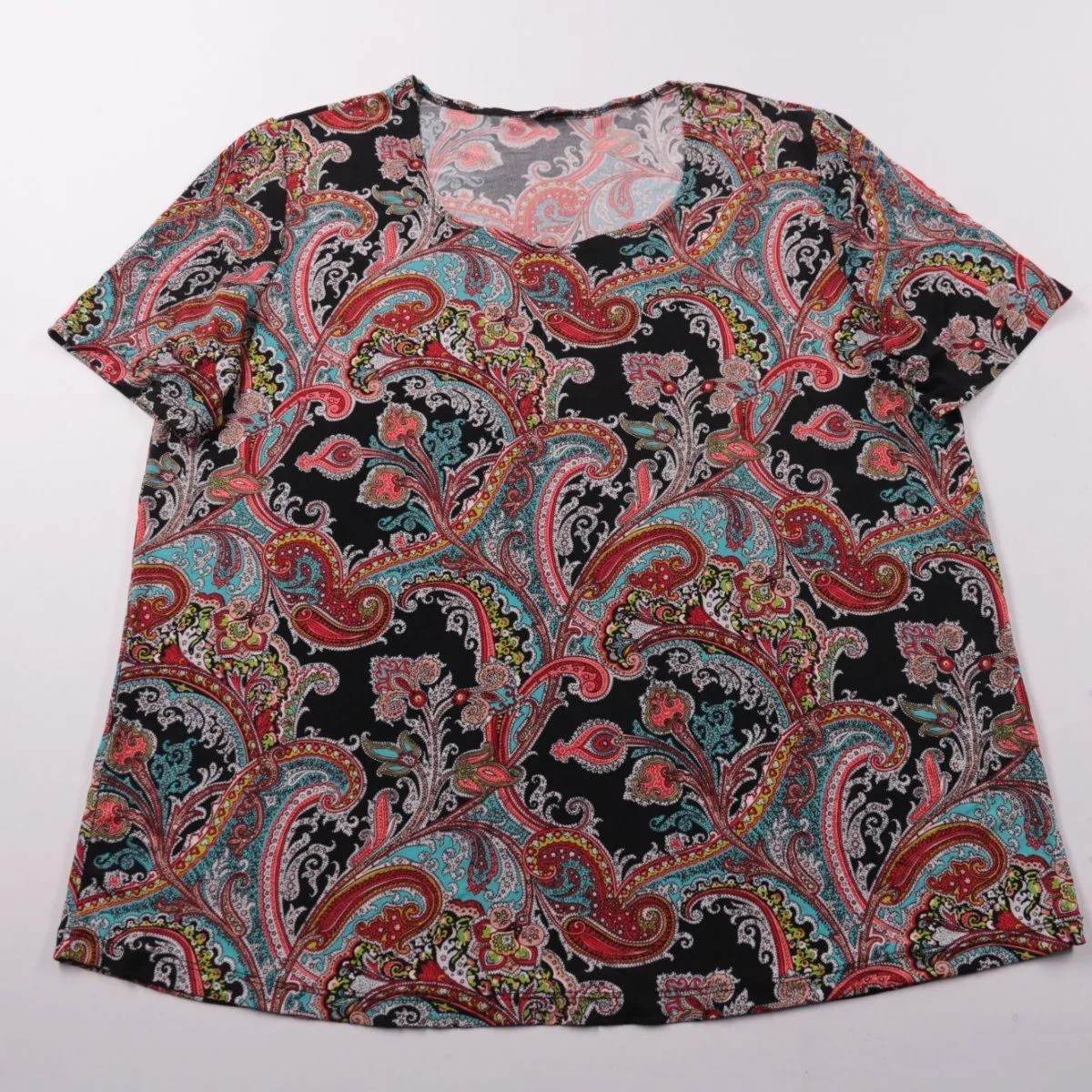 Женская блузка KIM&CO. с коротким рукавом и V-образным вырезом, выполнена в ярком пейсли-орнаменте на чёрном фоне. Подойдёт для повседневных образов и офиса с однотонными брюками или юбкой. Лёгкая ткань почти не мнётся и удобно носится в течение дня.