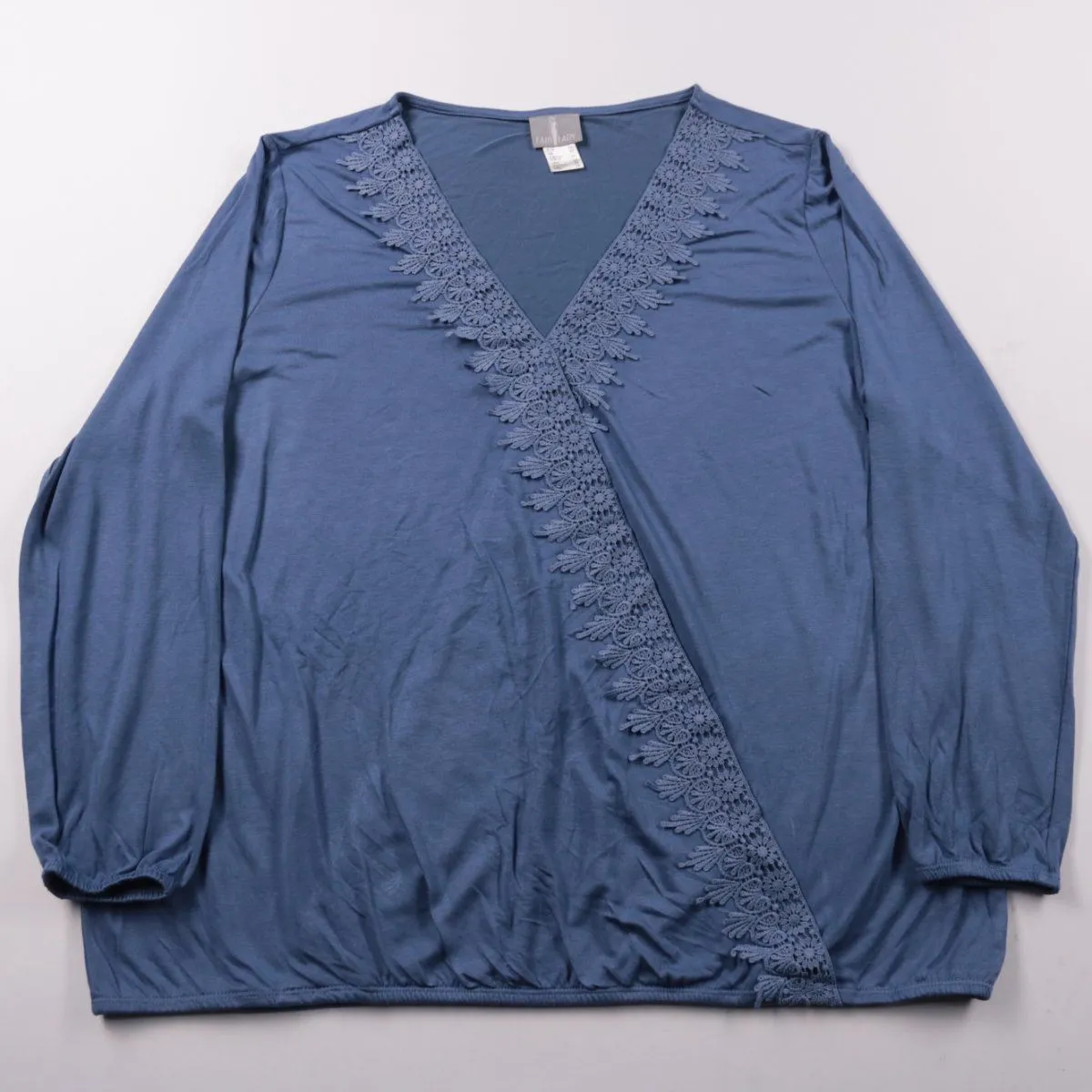 Женская блузка Fair Lady синего цвета с V-образным запахом и декоративным кружевом по планке. Подойдёт для повседневных образов и офиса, легко сочетается с брюками или юбкой. Мягкая вискозная ткань приятно ощущается на теле и хорошо драпируется.