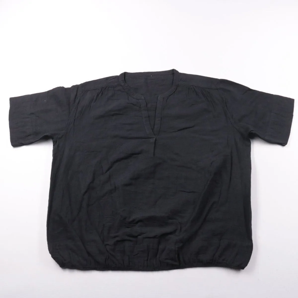 Женская чёрная блузка свободного кроя с коротким рукавом и V-разрезом у горловины. Подойдёт для повседневных образов и работы, легко сочетается с джинсами и классическими брюками. Практичный плюс — тёмный цвет и простой фасон не требуют сложного ухода.